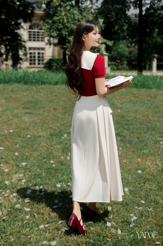 Váy Xếp Ly Thiết Kế Trắng Kem Phối Nơ Đen YAME YV919