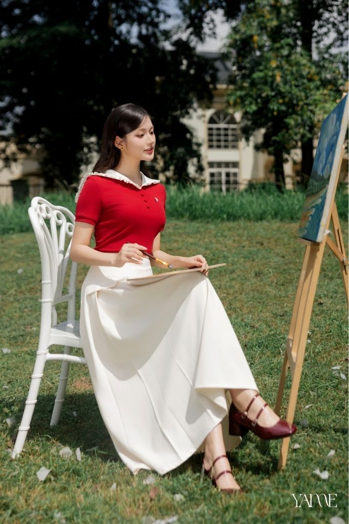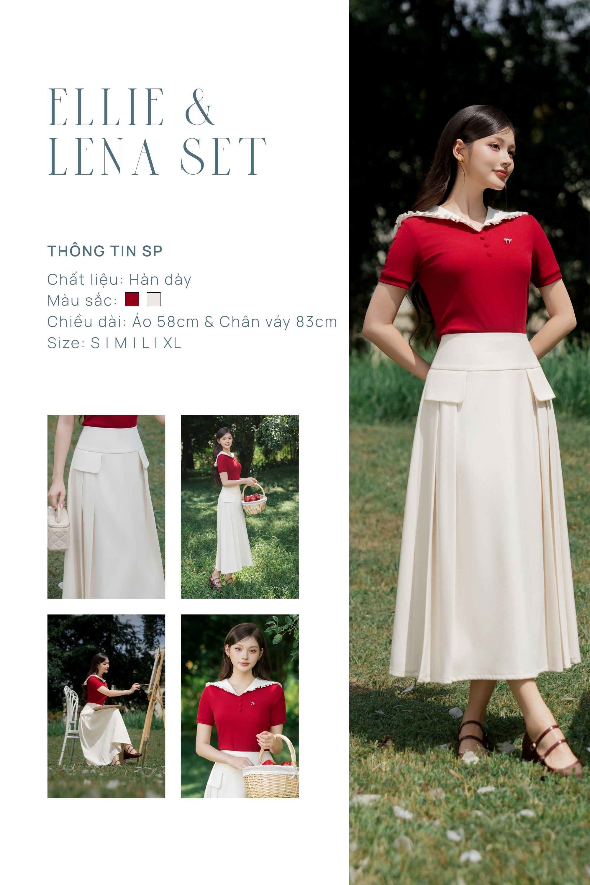 Set Nữ YAME Áo Đỏ Ngắn Tay Cúc Bọc Cổ Thủy Thủ & Chân Váy Xòe Dài Xếp Ly Bên - EllieYA729 LenaYCV730
