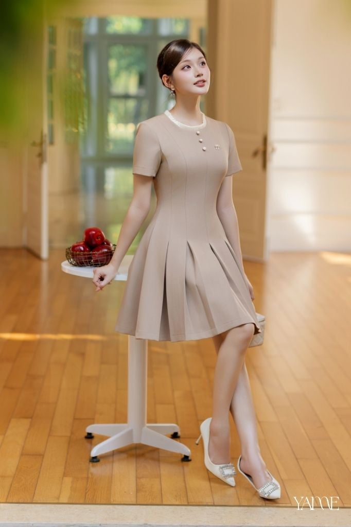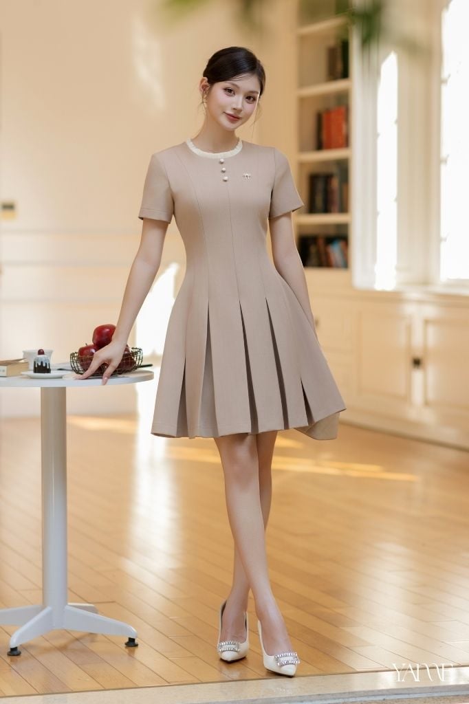 Váy Thiết Kế Dáng Xòe Nâu Be Cổ Bèo Nhún YAME YV737